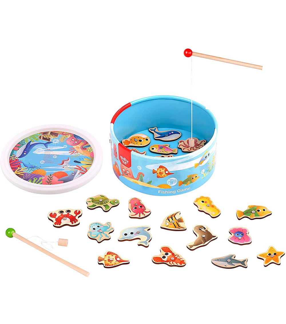 Oferim atentiei dumneavoastra Tooky Toy pescuit din lemn. Jocul vine cu o cutie rotundă convenabilă în care toate piesele pot fi depozitate cu sârguință.