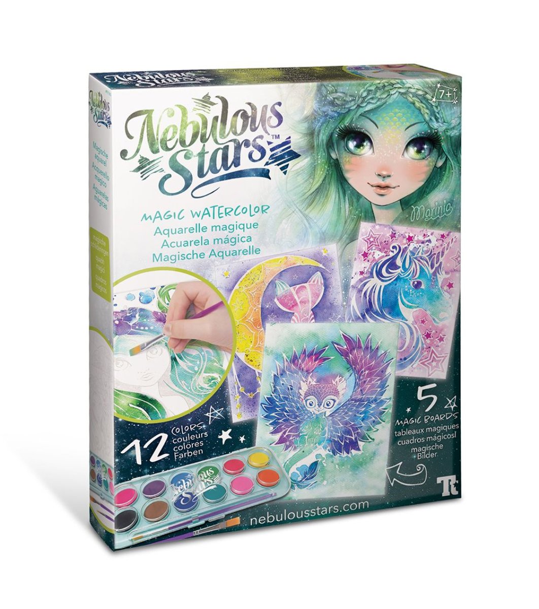 Nebulous Stars Picturi magice cu acuarele Marinia Dragostea pentru artă este cultivată de la o vârstă fragedă. Darul desenului îi poate ajuta pe copii să creadă în abilitățile lor. Asigurați-vă că fetița dumneavoastră își va dezvolta imaginația prin intermediul acuarelelor, cu ajutorul cărora poate crea picturi minunate. Lumi magice pot prinde viață cu ușurință sub pensulele celor mici și îi pot duce în locuri pe care doar imaginația lor le cunoaște. Datorită unei tehnologii unice, vopselele sunt aplicate doar pe anumite zone ale cartonului special, picturile fiind dezvăluite treptat și magic cu fiecare tușă de pensulă peste lucrare, acuarelele putând fi amestecate pentru a crea diferite nuanțe. Contururile picturilor sunt fosforescente în întuneric, pentru a face magia și mai magică.