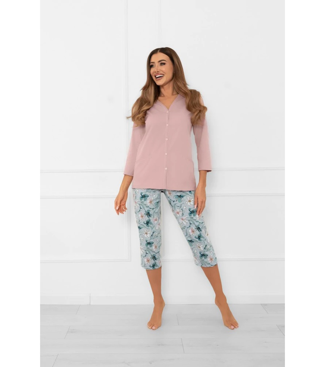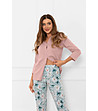 Italian Fashion Pijama roz pudră din bumbac cu imprimeu și mâneci 3/4 Sekwoja Top cu decolteu în V, închidere cu nasturi