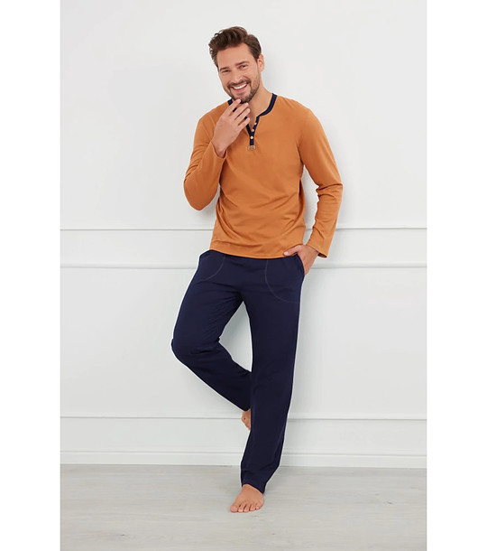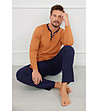 Italian Fashion Pijamale Juliusz din bumbac pentru bărbați, în culorile coniac și bleumarin Pijamale bărbătești din două piese