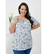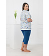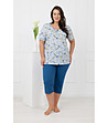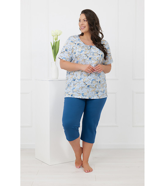 Italian Fashion Pijamale SAMOA din bumbac pentru femei, cu mâneci scurte și pantaloni 3/4, în culoarea albastră Top cu mâneci scurte, decolteu rotund și detalii fine încrețite în față.