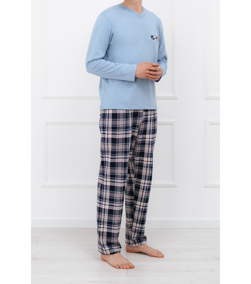 Italian Fashion Pijamale bărbătești albastre din bumbac cu mâneci lungi și pantaloni lungi EDWIN Top cu decolteu în V și mâneci lungi