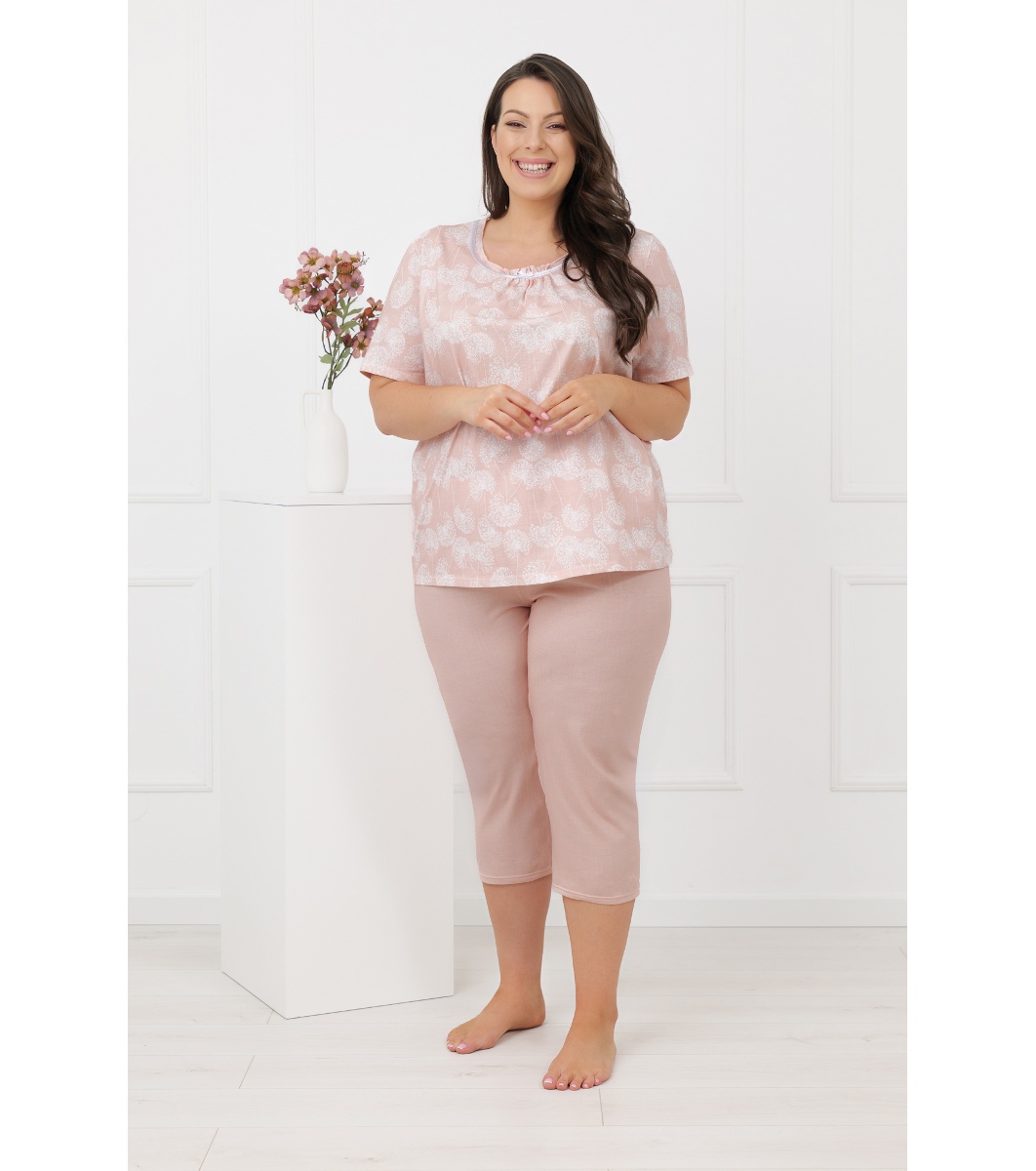 Pijamale de damă din bumbac cu mâneci scurte și pantaloni 3/4 ELENI în roz somon