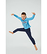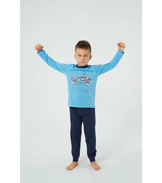 Italian Fashion Pijamale din bumbac pentru băieți, în albastru și bleumarin, cu imprimeu cu motociclete, Junak Top albastru deschis cu imprimeu