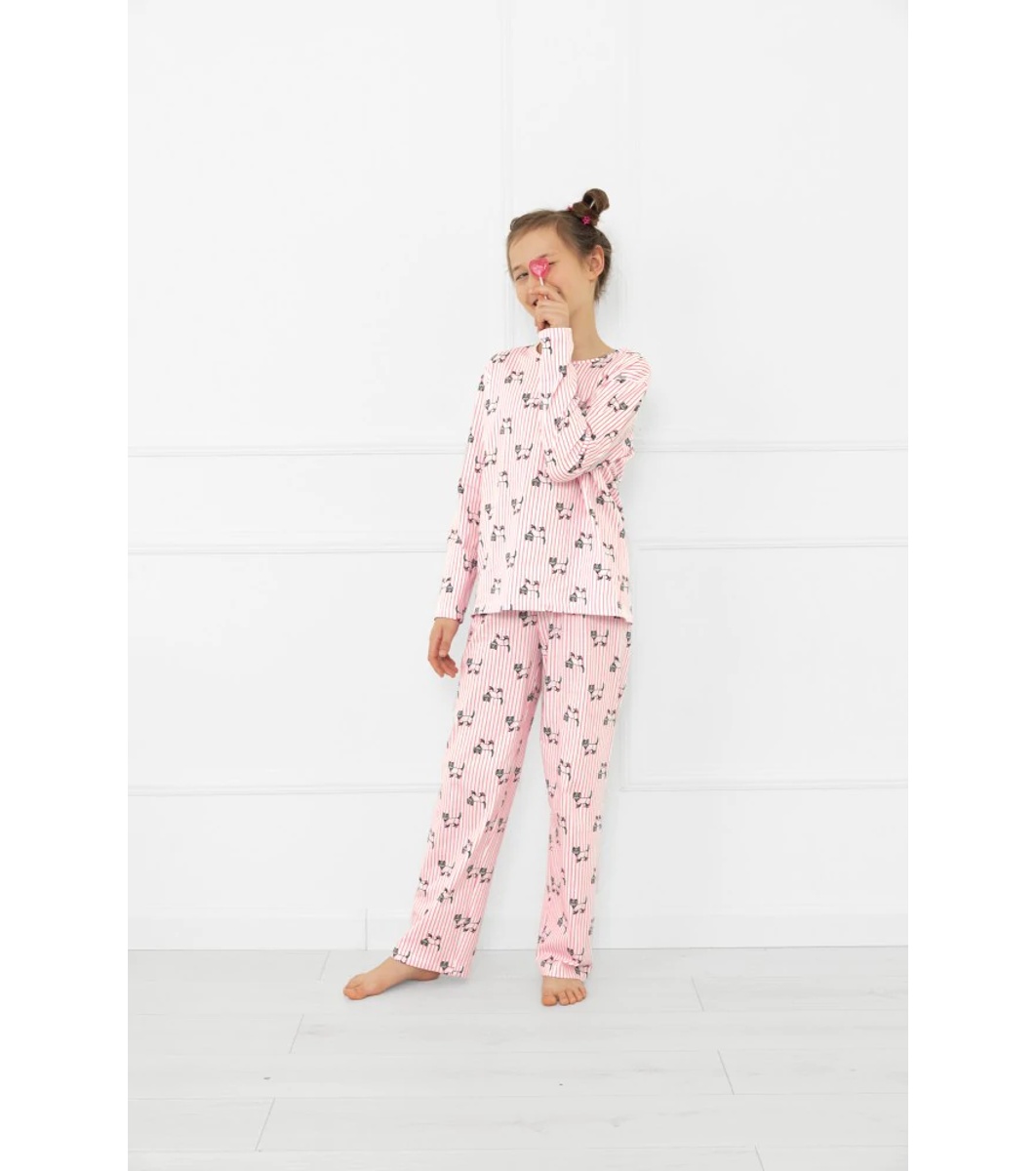 Italian Fashion Pijamale din bumbac pentru fete, în dungi albe și roz, Kiota, cu imprimeu cu pisici Top cu decolteu rotund