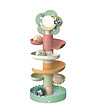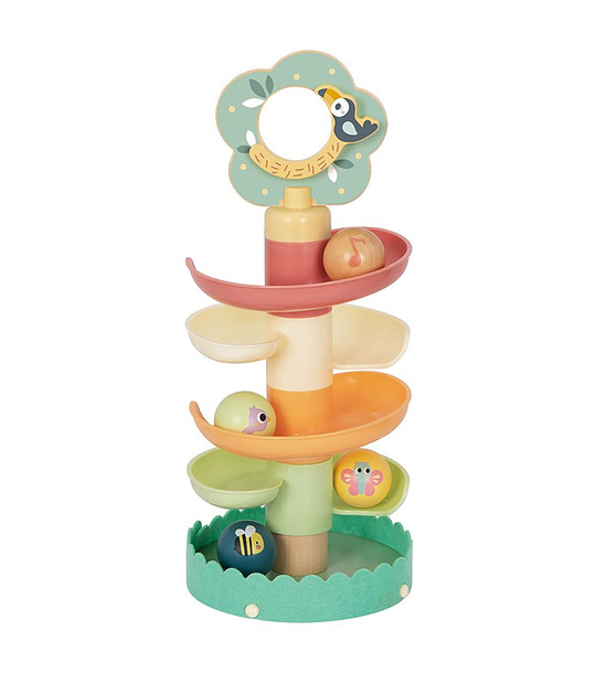 Jucăria include 6 piese construibile care formează un turn spiralat și 4 bile colorate, fiecare pictată cu diferite animale și note muzicale. Când mingea este eliberată de sus, copilul va fi interesat să o urmărească rostogolindu-se pe pistă, scoțând sunete blânde și creând un sentiment de ritm și mișcare.