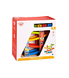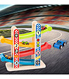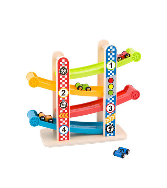 Pista este din lemn și plastic. Este colorat în culori strălucitoare și saturate, care sporesc și mai mult plăcerea jocului. În set vei găsi 4 mașini de curse și rampe colorate pe care să cobori și să te bucuri de trafic.