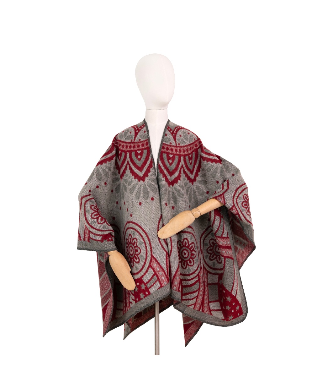 Poncho în gri, roșu închis și gri deschis cu motiv paisley