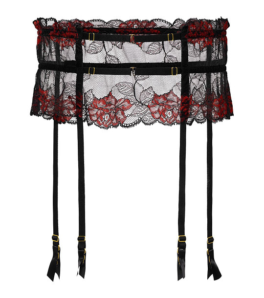 Portjartier din dantelă neagră cu motive florale roșii ROSE