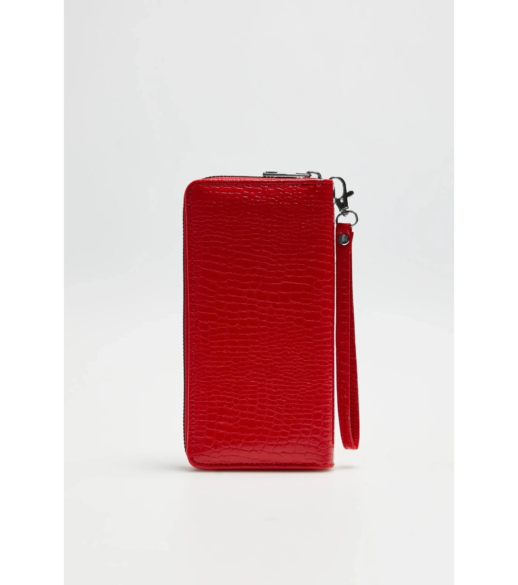 Un portofel cu un design curat și o textură care imită pielea. Are un fermoar lung pentru închidere sigură și o curea de transport confortabilă.
