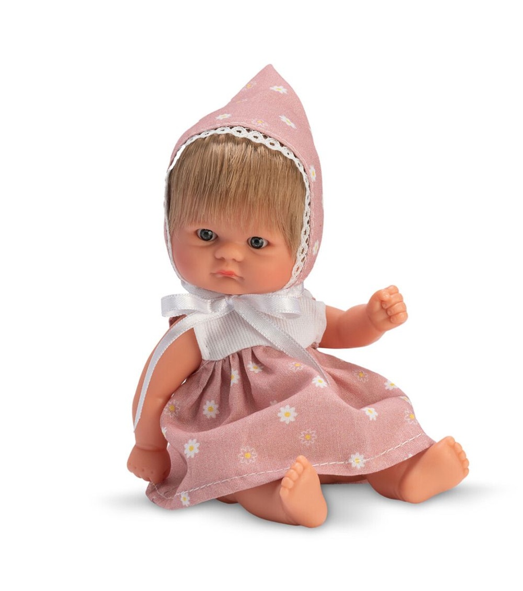 Cauți un bebeluș frumos și de înaltă calitate pentru fetița ta, dar și suficient de mic pentru a fi confortabil de transportat peste tot? Descoperă farmecul păpușii Bomboncin - cea mai mică și mai dulce adăugare la colecția brandului spaniol ASI. Are 15 cm înălțime, păr blond cu breton, ochi albaștri intensi și nu ar lăsa nicio domnișoară indiferentă. Este creată pentru joaca copiilor sigură și inspiratoare. Este îmbrăcată într-o rochie roz cu margarete delicate și o pălărie în același model. Profesioniștii de la Asi s-au ocupat de realismul producției păpușii.