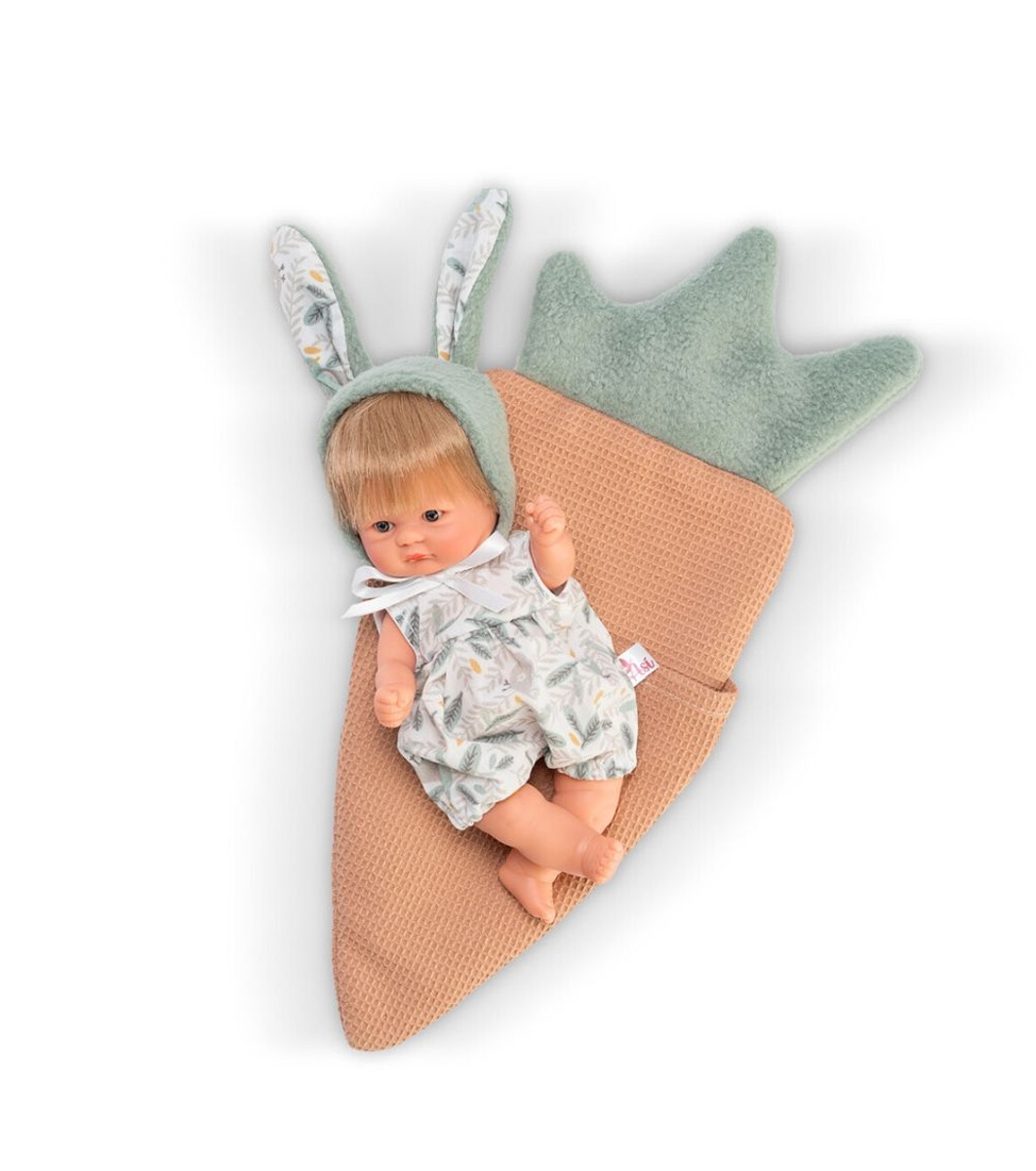 Asi Păpușă bebeluș Chiquita cu urechi de iepuraș și pungă cu morcovi 20 cm Faceți cunoștință cu adorabila păpușă Chiquita din seria Bomboncin. Are urechi drăguțe de iepuraș și un sac de dormit în formă de morcov. Chiquita este cel mai mic și mai drăguț bebeluș din colecția brandului spaniol Asi! Cu o înălțime de 20 cm, un corp complet cauciucat și membre mobile, această păpușă este perfectă pentru mânuțele mici și pentru ore lungi de joacă. Va fi o prietenă loială care va aduce bucurie și căldură fiecărui copil. Profesioniștii de la Asi s-au ocupat de realismul măiestriei păpușii. Au reprodus trăsăturile expresive ale feței și pliurile de pe picioare, astfel încât păpușa este ca una reală.