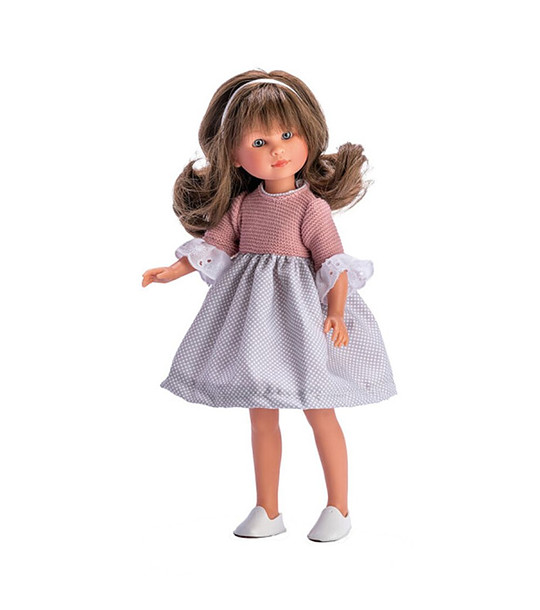 Păpușa Celia cu rochie în carouri gri-alb și roz 30 cm