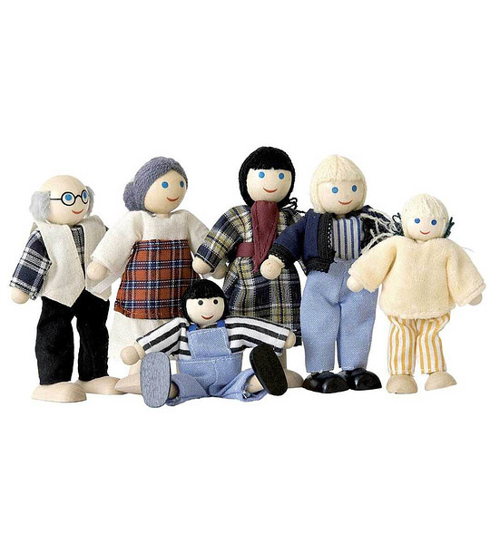 Păpușile sunt realizate din materiale naturale și au brațe și picioare mobile. Setul include 6 buc. păpuși - bunici, mamă și tată și copii - un băiat și o fată cu îmbrăcăminte tipică de zi cu zi.