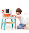 Atelierul pentru copii este in culori frumoase - portocaliu si verde menta, in set vei gasi 34 de piese pe care le poti insuruba, insuruba sau ciocani - activitati utile pe care copiii le adora.