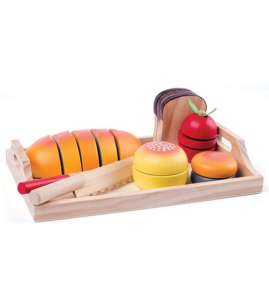 Setul conține 19 piese - o tavă, două cuțite, 1 pâine, felii de pâine, roșii etc.