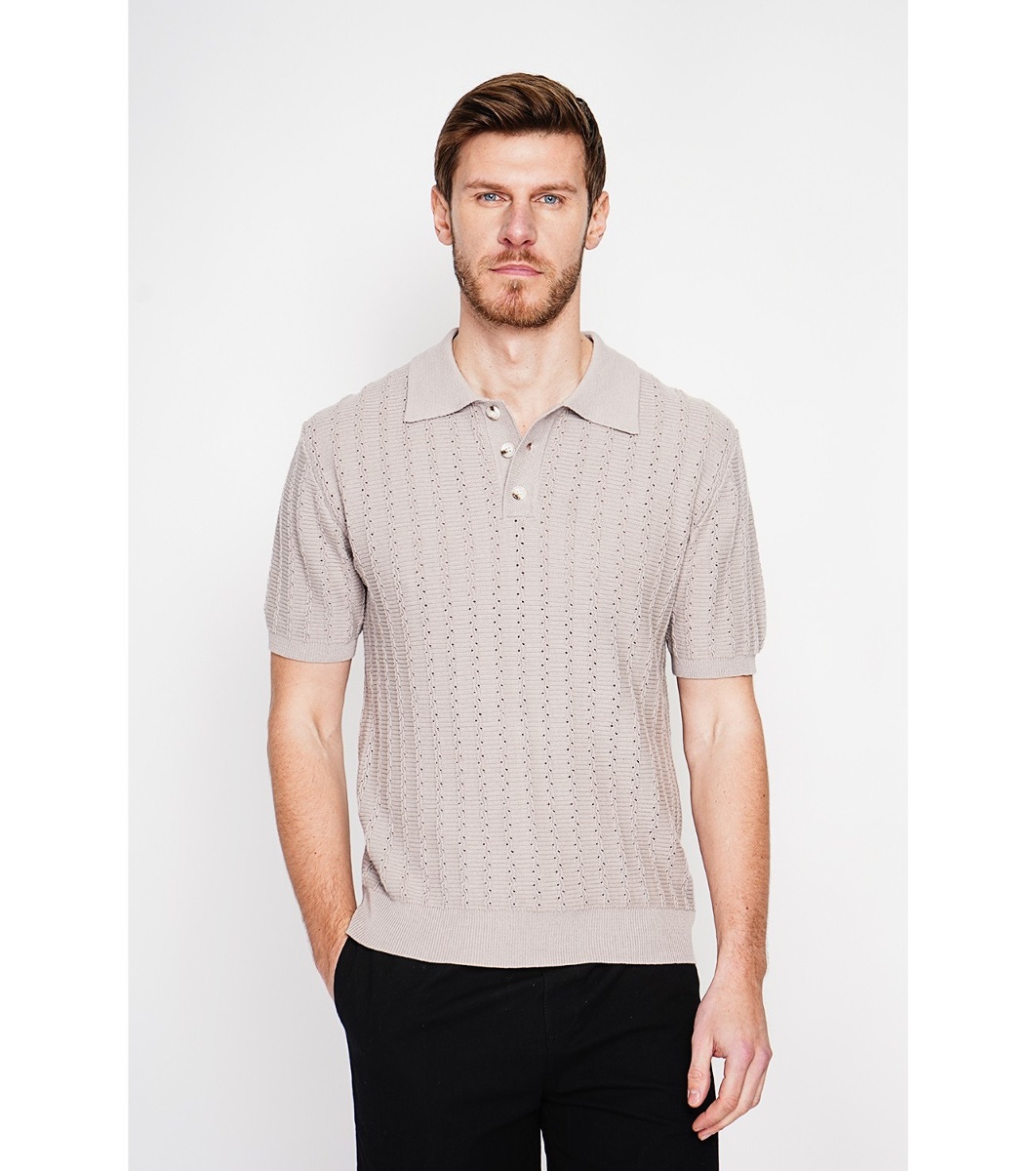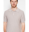 Secret Du Lin Pulover bej bărbătesc cu mânecă scurtă, confecționat din bumbac organic și in Pulover bărbătesc tricotat fin, cu guler polo și mâneci scurte.