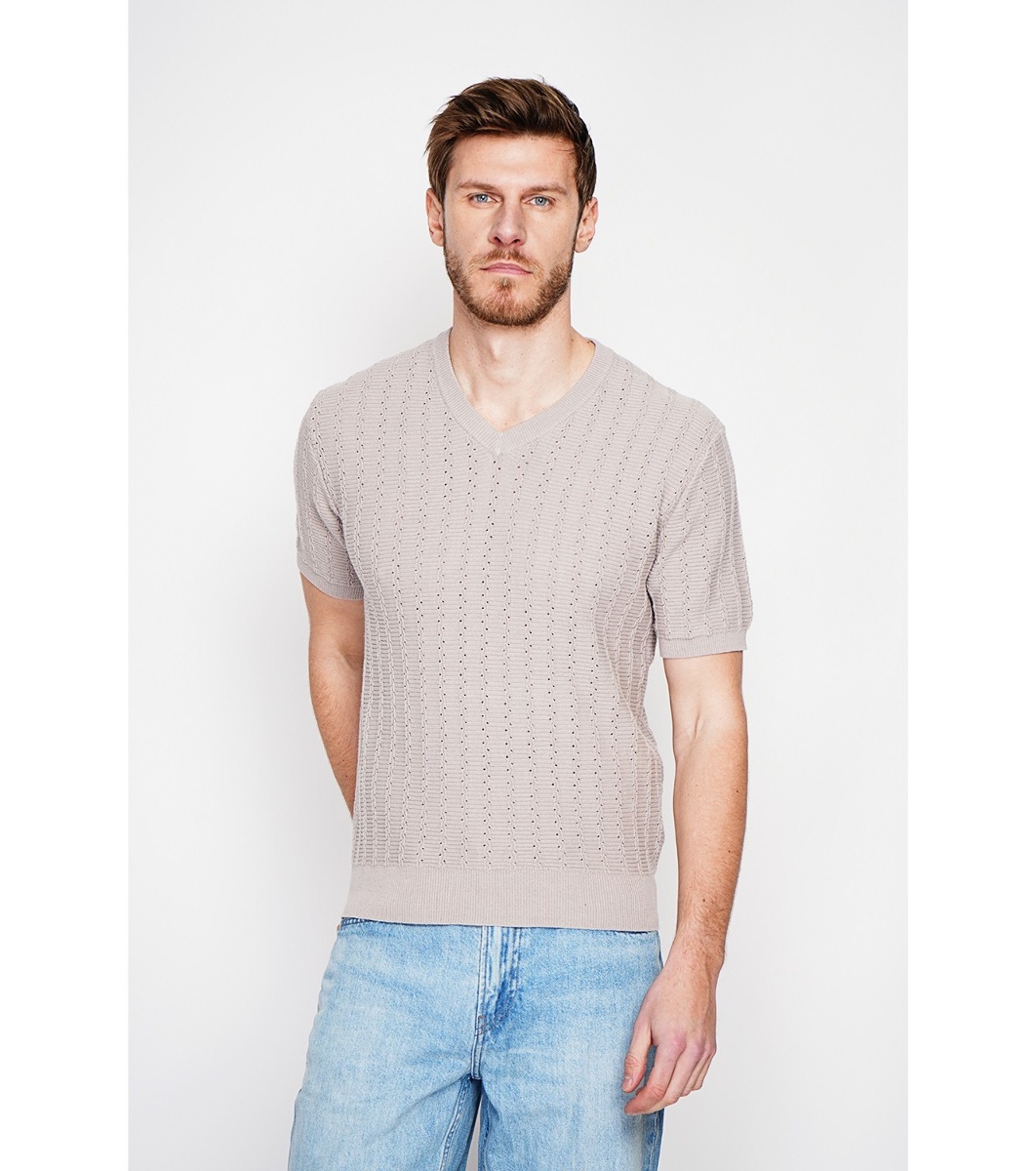 Secret Du Lin Pulover bej bărbătesc cu model ajurat, confecționat din bumbac organic și in Pulover tricotat cu decolteu în V.