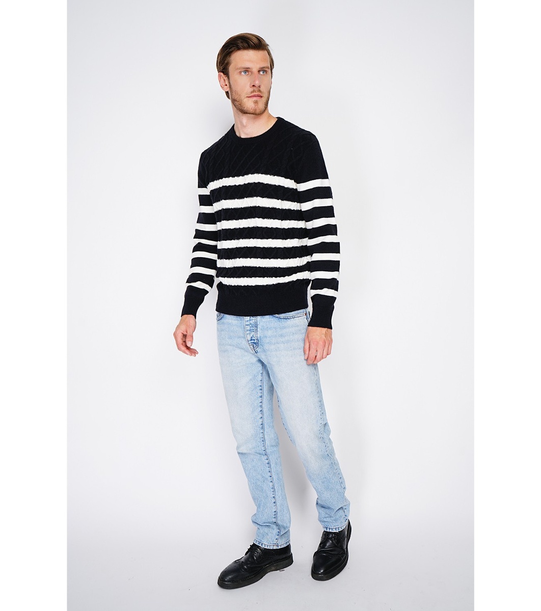 C&Jo Pulover bărbătesc negru cu dungi albe Decolteu rotund