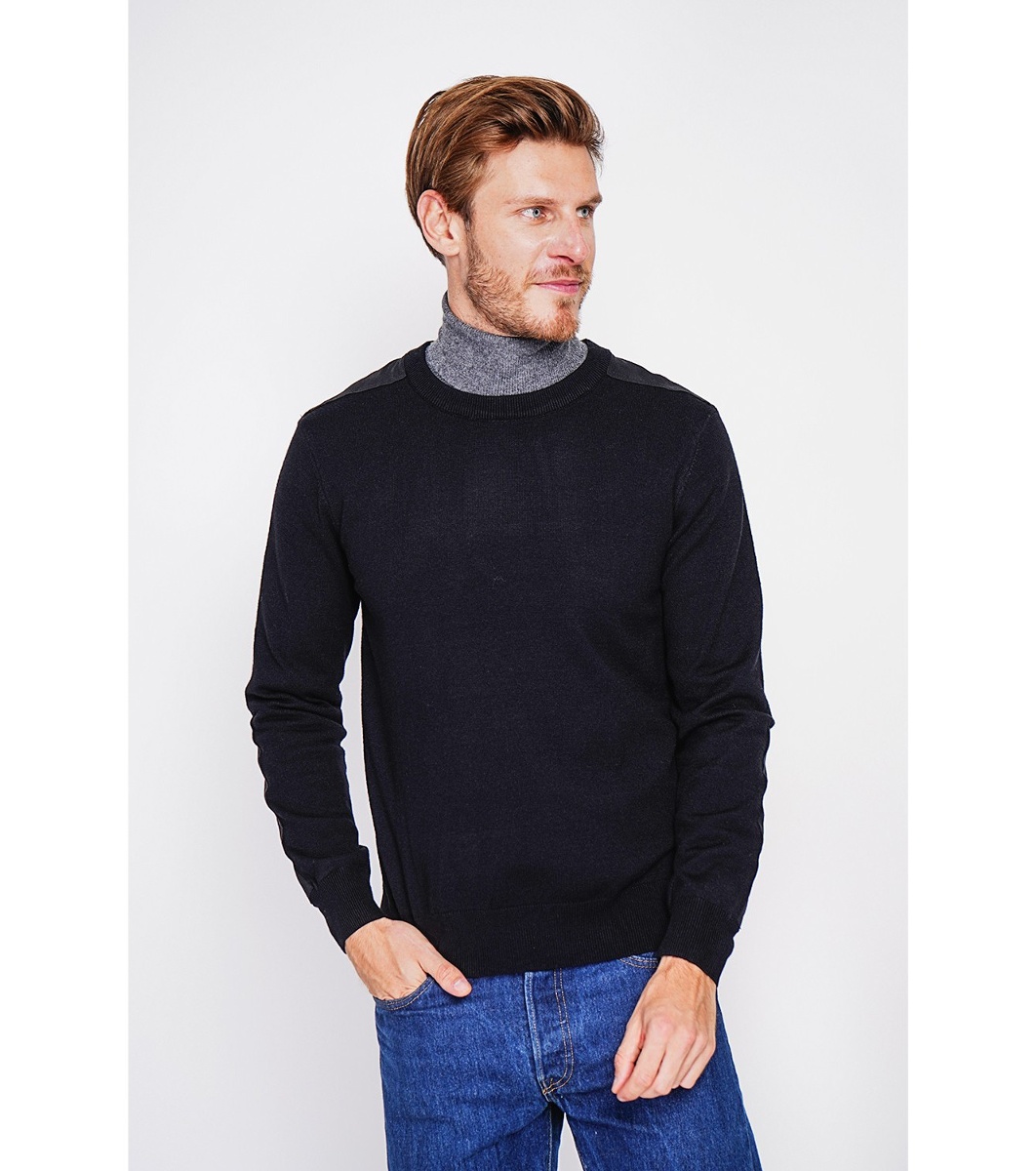 C&Jo Pulover bărbătesc negru cu elemente contrastante Pulover tricotat fin cu elemente textile pe umeri și mâneci