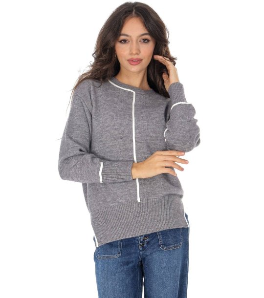 Roh Pulover gri de damă cu dungă contrastantă Pulover tricotat moale