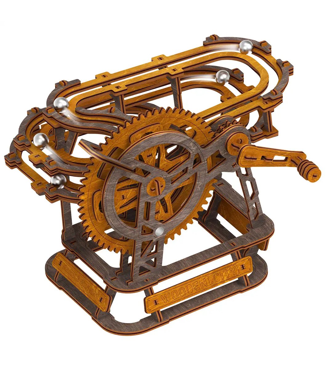 Model 3D mecanic pentru asamblare, realizat din lemn, cu un nivel mediu de complexitate (3 din 5).