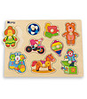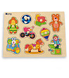Puzzle-ul cu mânere din lemn și imagini cu jucării, format din 9 elemente, potrivit pentru cei mai mici copii.