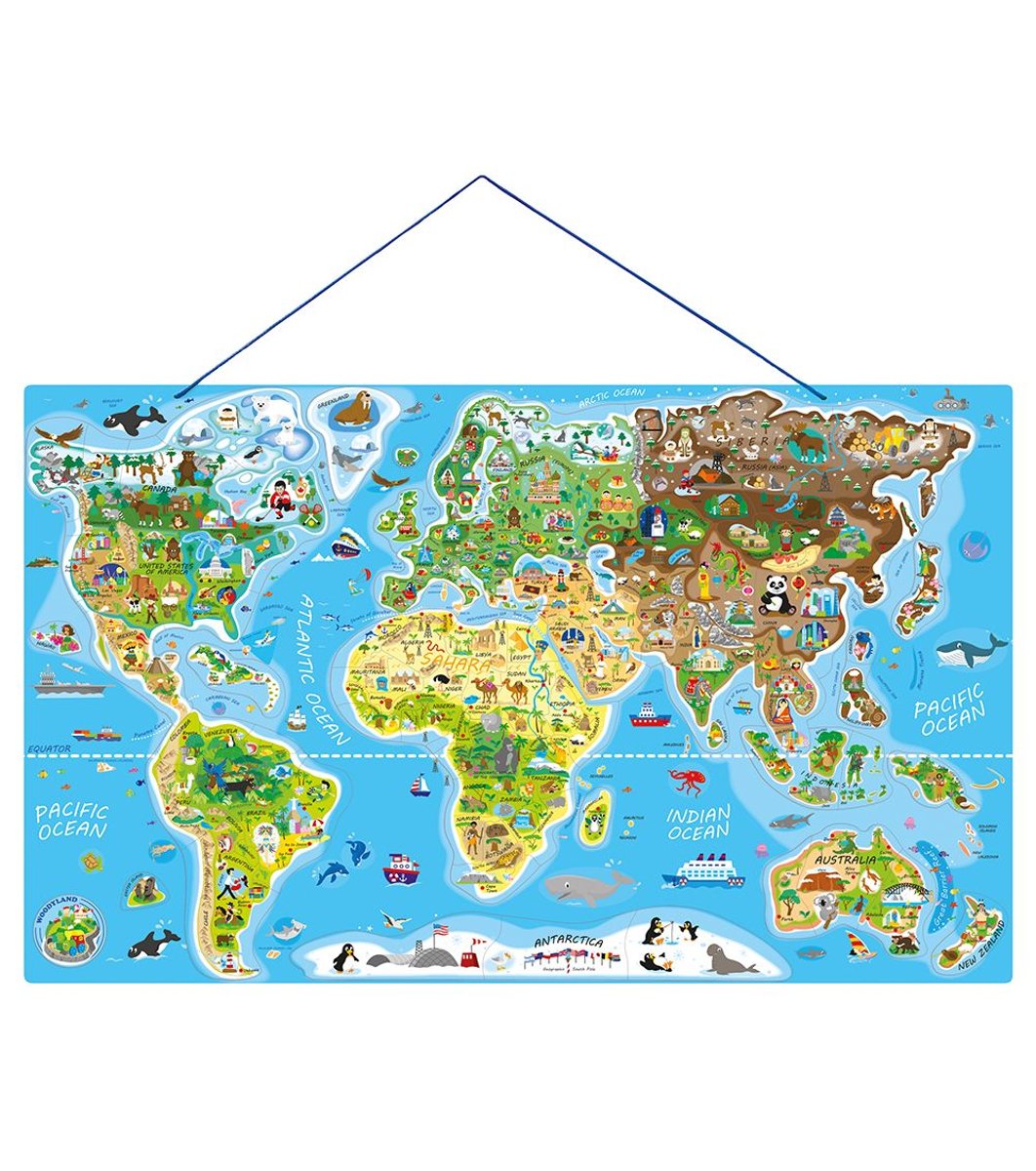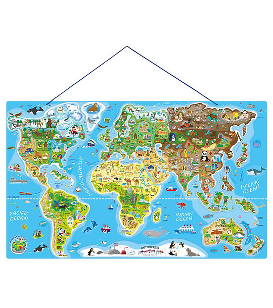 Puzzle din lemn cu piese magnetice Hartă a lumii 3 în 1