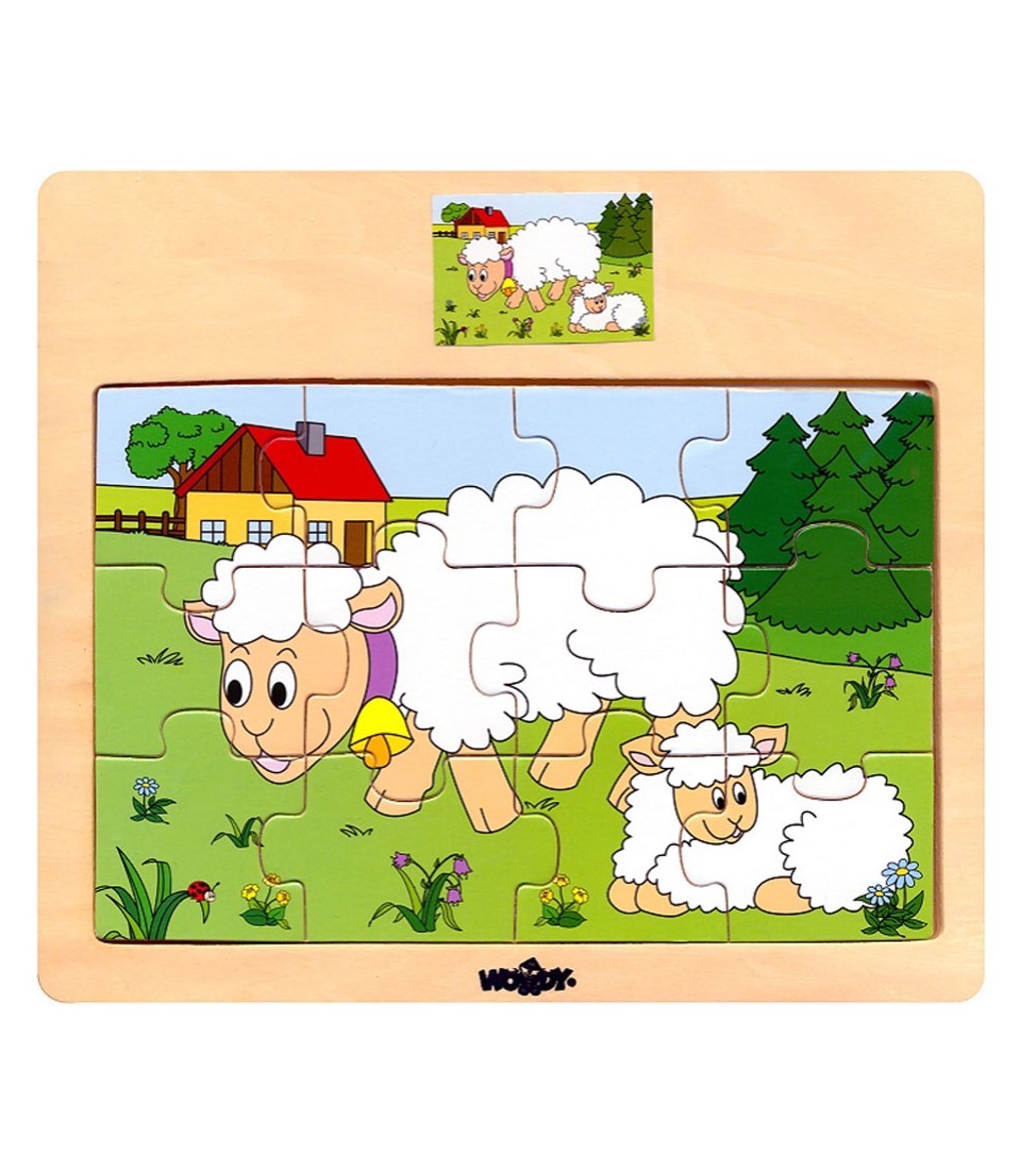 Puzzle pentru copii cu ramă din lemn, format din 12 piese, cu un indiciu.