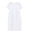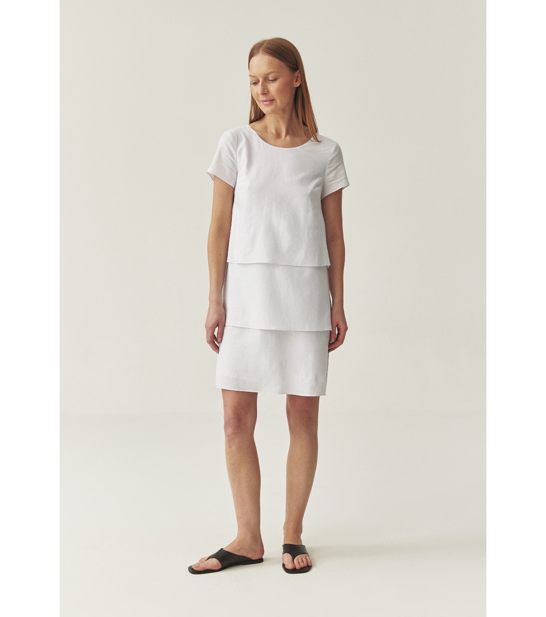 Rochie cu croială dreaptă, lungime până la genunchi. Mâneci scurte și decolteu rotund. Efect multistrat cu două panouri orizontale în față și spate. Închidere la spate cu o gaură mică și nasture.