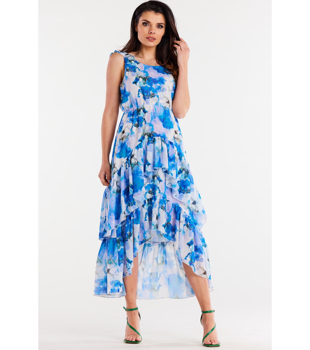 Awama Rochie asimetrică din șifon în alb și albastru Ofelia Bretele late
