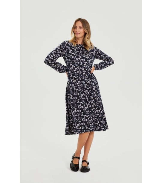 Moodo Rochie bleumarin cu mâneci lungi și imprimeu floral Rochie cu mâneci lungi, lungime până la gambă.