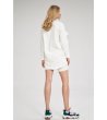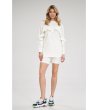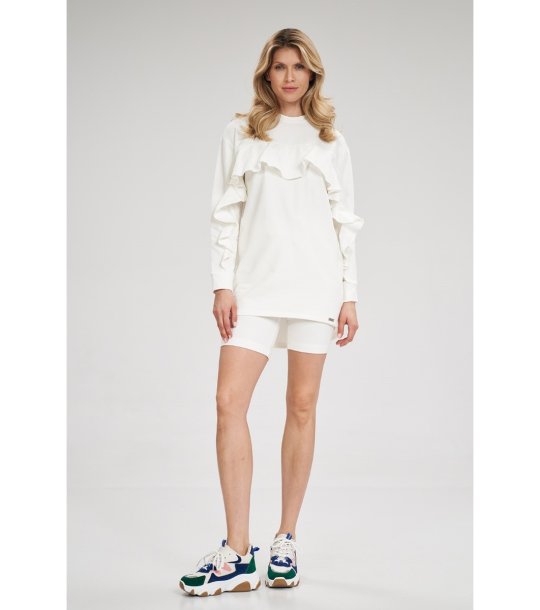 Rochie cu croială dreaptă și mâneci lungi, decorată cu un volan care se întinde peste bust. Decolteul este înalt, iar spatele are o formă semicirculară alungită.