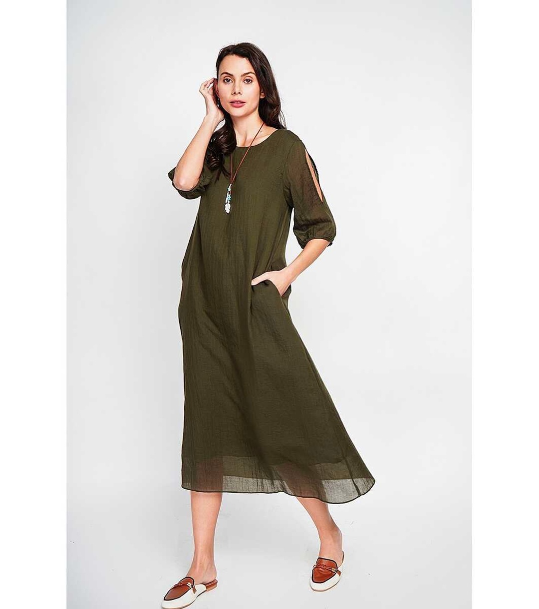 Assuili Rochie din in cu maneci spectaculoase de culoare kaki Decolteu rotund