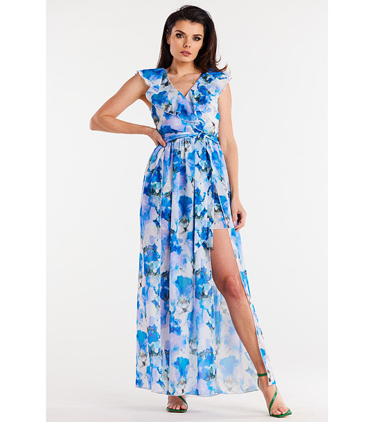 Awama Rochie lungă din șifon în alb și albastru deschis Elif Decolteu în V cu volan
