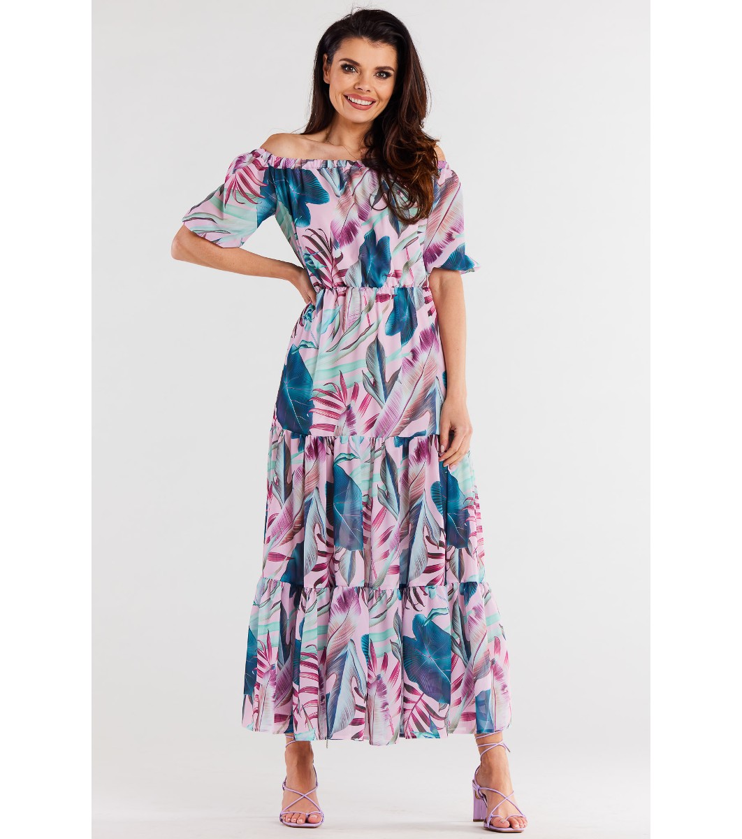 Awama Rochie lungă din șifon roz și albastru cu imprimeu Ohara