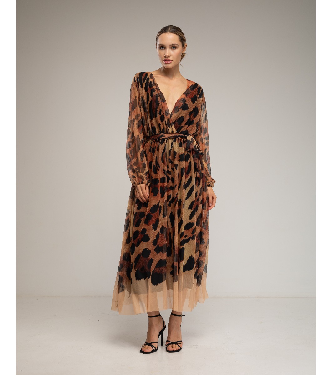 Tantra Rochie midi din tul maro cu imprimeu animal Decolteu în V