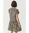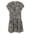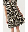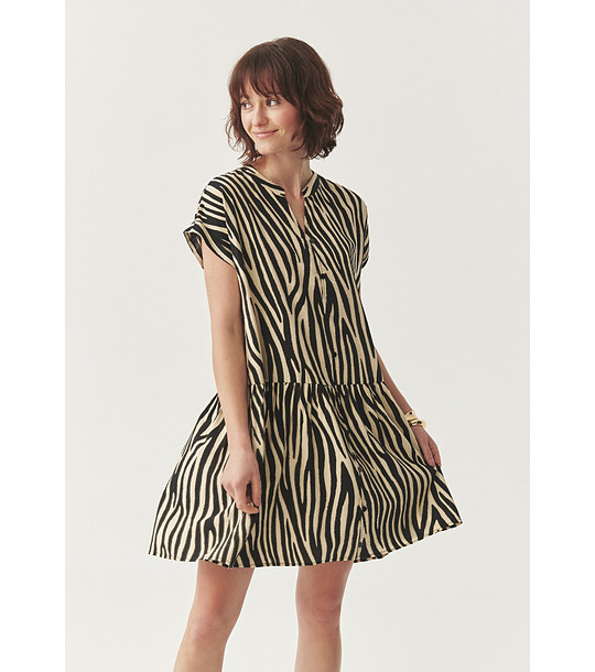 Rochie cu partea de sus dreaptă și partea de jos evazată cu o linie ușor încrețită. Lungime deasupra genunchiului. Mâneci scurte cu efect îndoit. Decolteu în V cu guler înalt mic. Închidere cu nasturi în față pe toată lungimea părții de sus. Imprimeu animal pe toată suprafața.