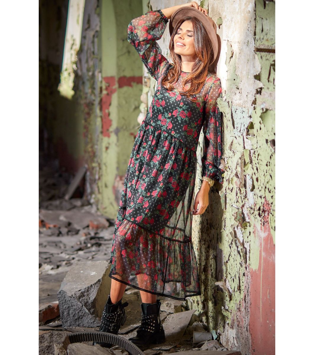 Rochie neagră vaporoasă cu imprimeu cu trandafiri Caren