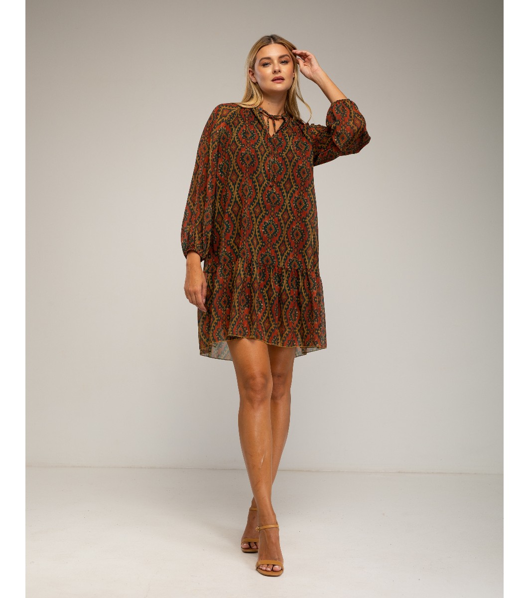 Tantra Rochie vișinie și maro cu imprimeu figurat Legătură la decolteu