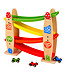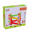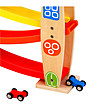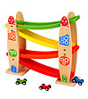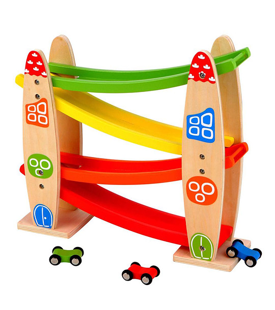 O jucărie frumoasă, distractivă și de înaltă calitate, deosebit de atractivă pentru băieți. Doar puneți mașina deasupra pistei și începeți cursa. Căruciorul va coborî până jos, depășind toate obstacolele. Setul include o pistă cu patru jgheaburi și trei cărucioare rapide: verde, roșu și albastru. Rolul este realizat din lemn de calitate si vopsit în culori vii.