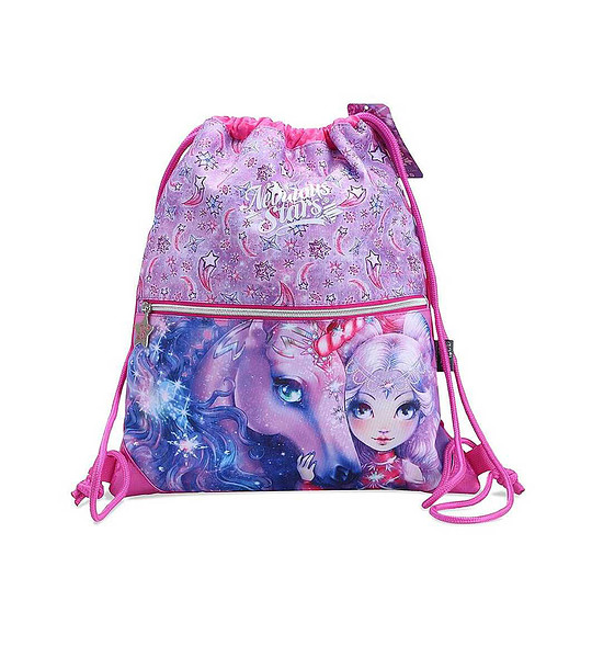 Aceasta este o geantă de sac frumoasă, cu Prințesa Nebulia și unicornul ei, pe care fiecare copil îl va îndrăgi.