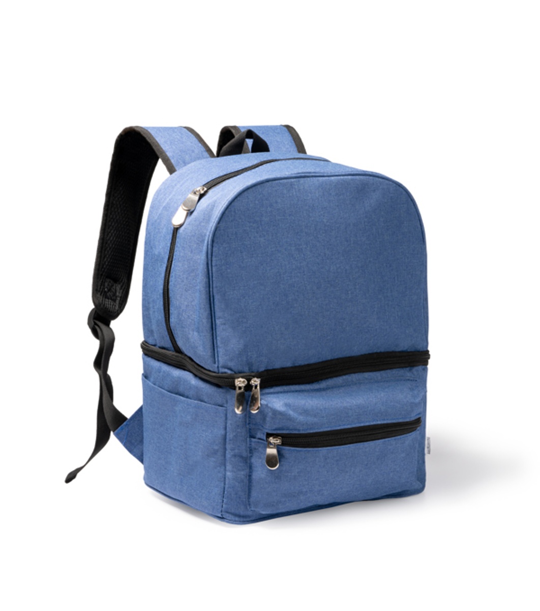 Rucsac termic din RPET 300D cu compartiment dublu, buzunar frontal cu fermoar și 2 buzunare laterale.