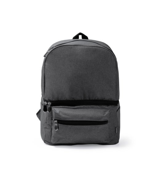 Rucsac termic din RPET 300D cu compartiment dublu, buzunar frontal cu fermoar și 2 buzunare laterale.