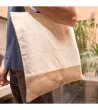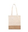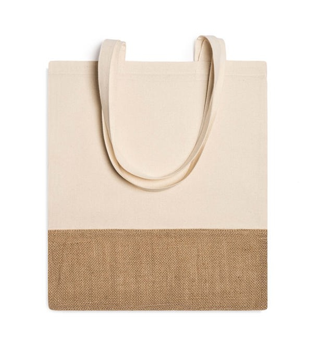 Sacoșă de cumpărături ecologică din bumbac 120 g/m2 și iută în culoare naturală, cu o parte din iută în partea de jos a unei laturi a genții și mânere cu o lungime de 70 cm.