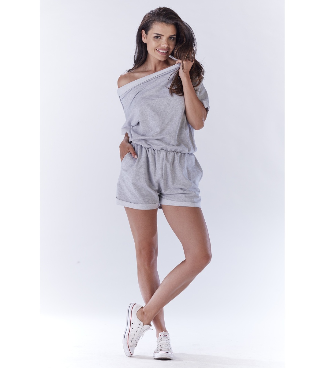 Awama Salopetă scurtă din bumbac, în culoarea gri melanj Rosaly Decolteu tip barcă cu umeri deschiși