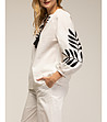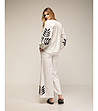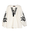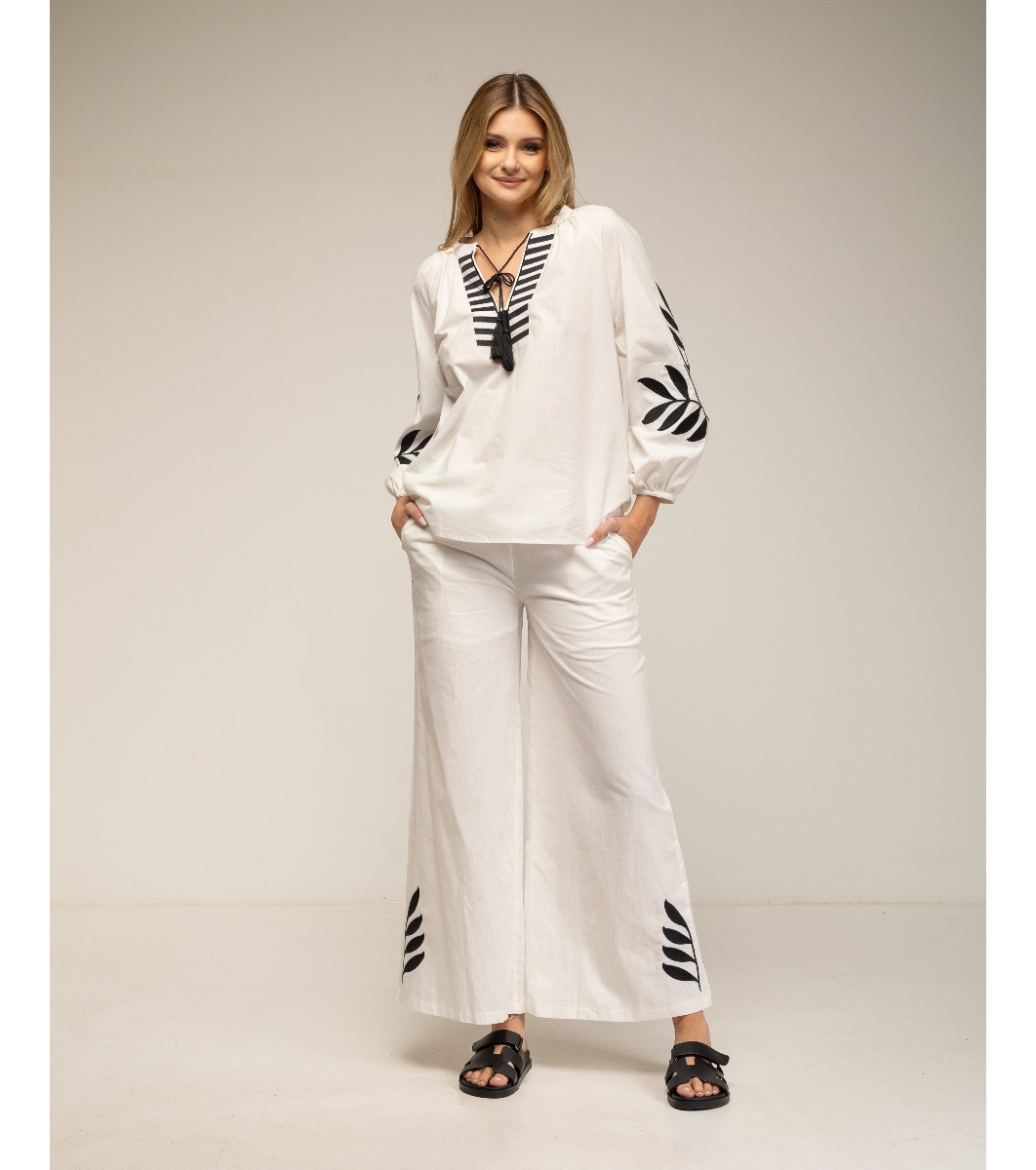 Set format din bluză cu mâneci lungi și pantaloni largi, drepți. Bluza are decolteu în V, se leagă cu ciucure și o încrețitură elastică de-a lungul decolteului tip barcă. Mânecile sunt voluminoase cu elastic în partea de jos. Pantalonii au talie înaltă, croială dreaptă și largă și lungime până la gleznă. Ambele piese au broderie contrastantă pe mâneci, decolteu și în partea de jos a picioarelor. Spălare la mașină la 30°C. Călcare la temperatură medie.