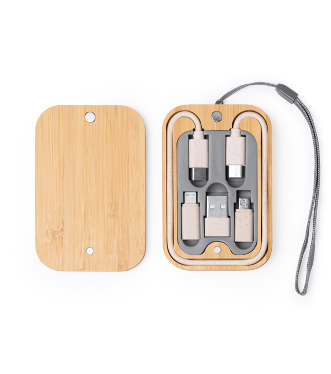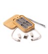 Set cablu de încărcare, prezentat într-o cutie de bambus cu capac magnetic.