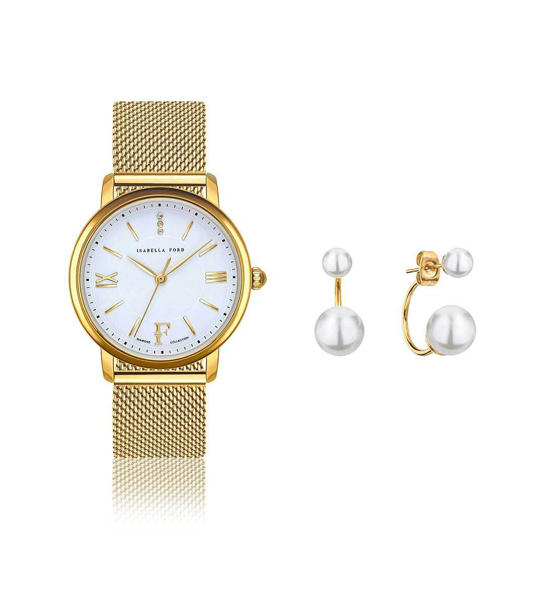 Isabella Ford Set ceas de aur și cercei cu perle de apă dulce