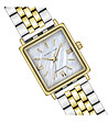 Ceas de damă de culoare aurie, cu carcasă dreptunghiulară și cadran din sidef.